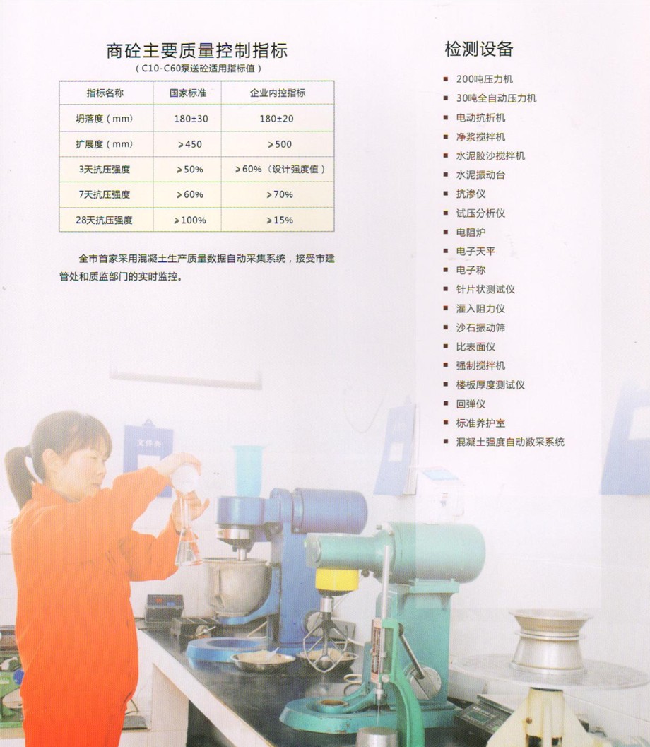 公司設(shè)有先進(jìn)的實(shí)驗(yàn)室,配備全套混凝土及原材料檢測(cè)試驗(yàn)設(shè)備,配有專(zhuān)職的試驗(yàn)、檢驗(yàn)人員,可承擔(dān)混凝土的材料性能試驗(yàn),工藝質(zhì)量控制、產(chǎn)品質(zhì)量檢驗(yàn)等全部試驗(yàn)、檢驗(yàn)項(xiàng)目,為確;炷临|(zhì)量提供了可靠的保證。